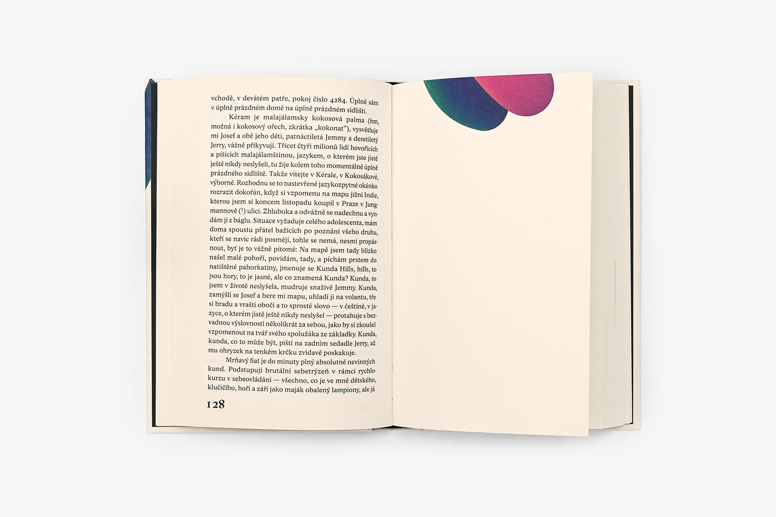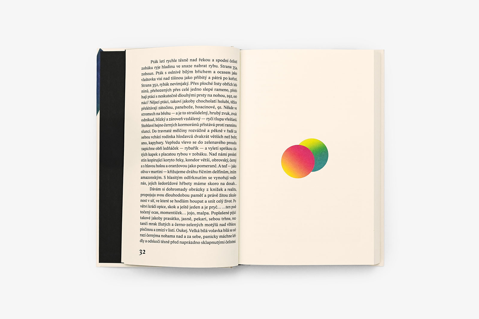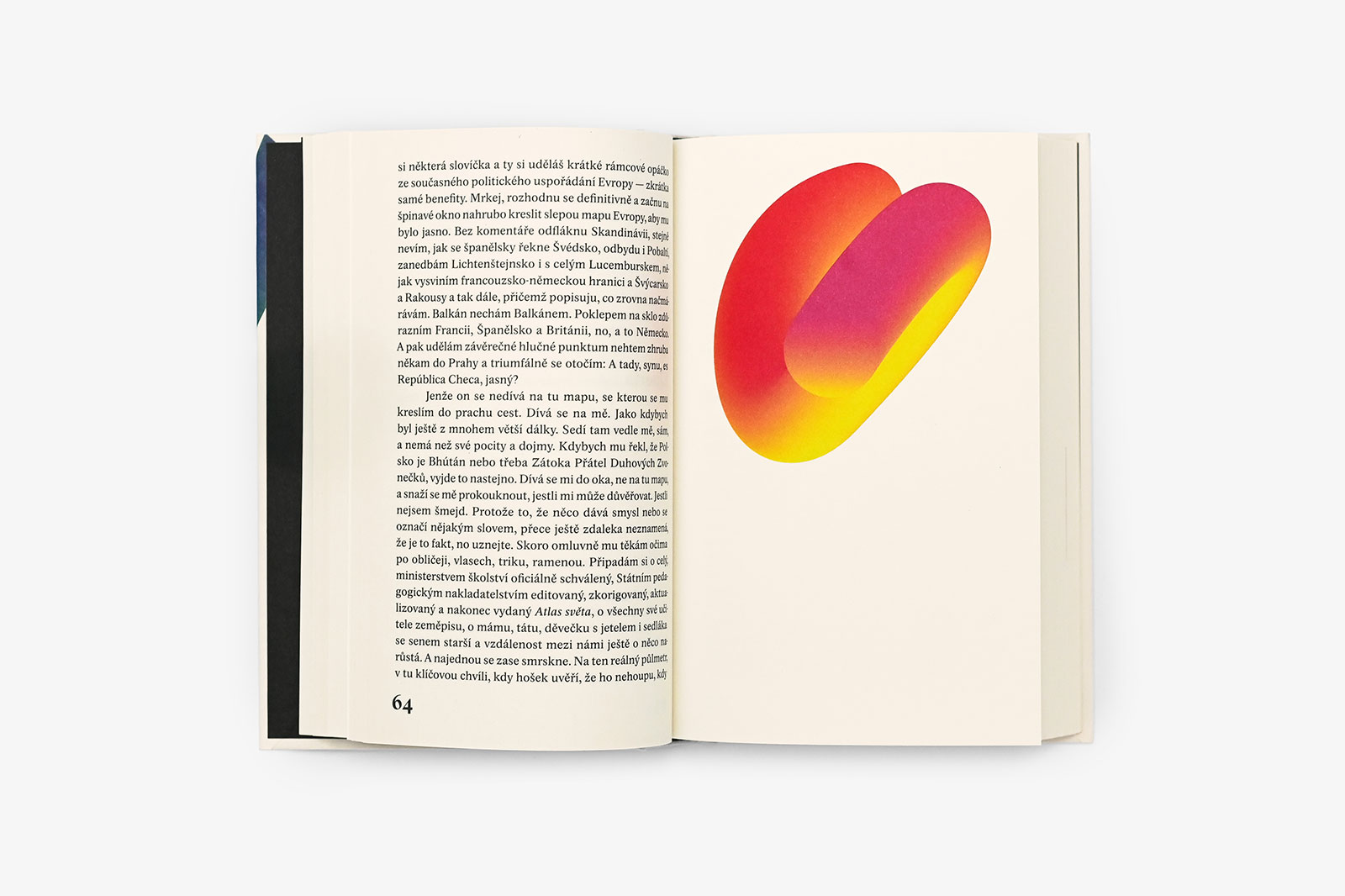 Nedivte se proto, že se úprava obejde bez obligátního gezichtu na obálce či vazbě. Do literatury tohle podbízení prostě nepatří. Namísto toho jsem připravil soubor velmi abstraktních ilustrací, přecházejících z vazby dovnitř svazku ve formě vlepovaných příloh. Ústředním motivem je vlastně hadovitě klikatá cesta, pohyb, různé okliky a zase i návraty. Obraz využívá iluze prostoru — je to nejen ta zdánlivě trojrozměrná buclatá křivka, modelovaná světlem, ale i využití mezilehlého prostředí, které známe z pozorování krajiny, kdy se působením atmosféry jeví vzdálené barvy jako chladnější.